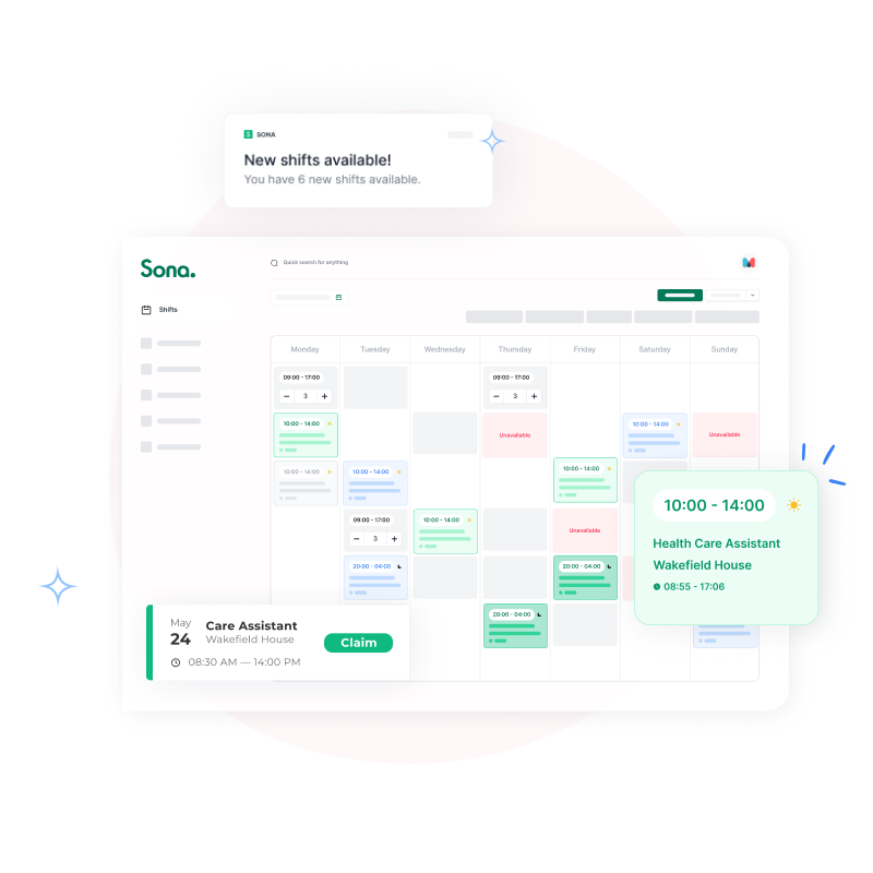 • Mark vacant shifts as 'open' while building/amending the rota - all staff can then see and instantly claim any unfilled shifts in the Sona app.