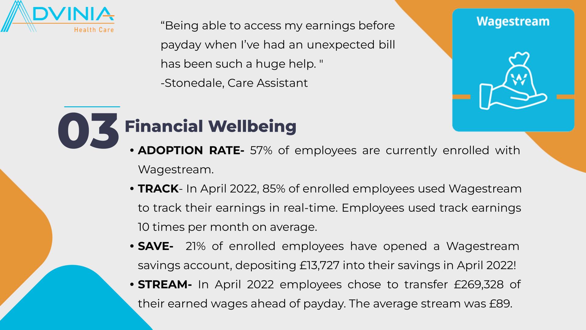 Advinia has partnered with Wagestream to enable staff to track their earnings in real time and transfer earned wages across ahead of payday. Over 20% have a Wagestream savings account so they can put money aside straight from their salary.