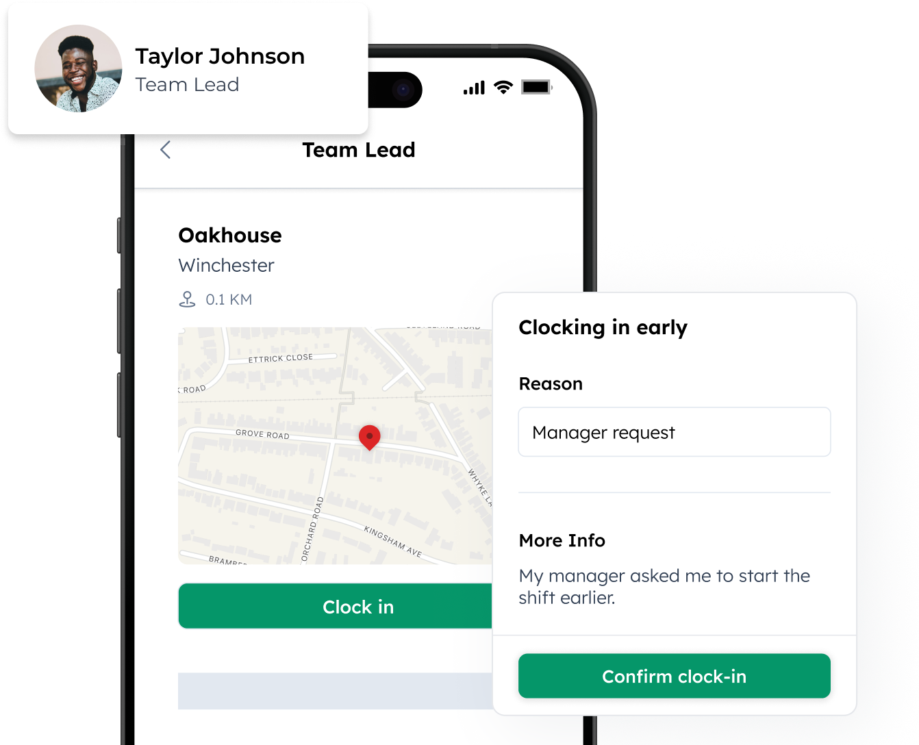 Managers also save time by having all hours logged by their teams as well as justifications for any early/late clock-ins available to them in the system - no need to spend time chasing down explanations or missing timesheets.
